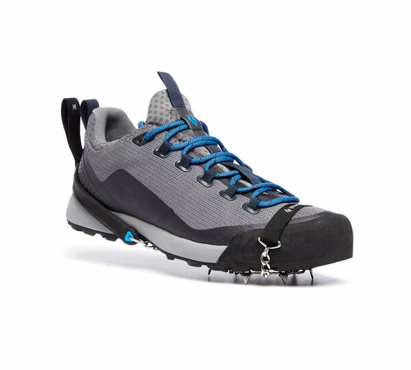 The Blitz Spike is our ultralight trail traction device at only 57 grams per device. Engineered for fast and light missions with ultimate packability, the Blitz Spike features 6 stainless steel spikes on the forefoot for superior strength and durability. Drawing from our extensive experience designing climbing crampons, the 6 forefoot spikes have an optimized 8mm length, designed to provide excellent engagement on snow and ice, with improved stability on rock when the trail ends and the scramble begins. The heel retention elastomer and webbing toe loop keeps the Blitz featherweight while providing a stable and secure fit.