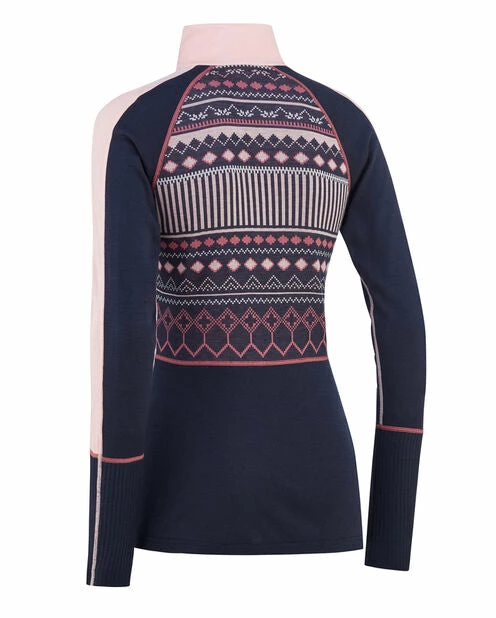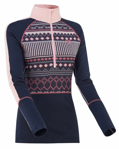The Kari Traa Perle Half-Zip is a mixed-blend women’s baselayer top with a bold jacquard-knit design on the chest. The quick-drying fabric wicks moisture away from your body when things heat up. The slim cut, ribbed forearm and solid-color raglan sleeves add to the look and make it great for wearing under other layers. This all-season favorite is also great for mix-and-matching with the Perle Pant styles. FIT: Slim silhouette, raglan sleeves, high collar