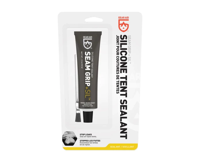 Seam sealing with Seam Grip SIL is the best way to keep moisture out when using a silnylon (silicone-nylon) tent. Previously known as SilNet, this clear sealant dries to a flexible rubber that works on all silicone treated gear including nylon tarps and ultralight backpacks. A single 1.5 oz tube can seal up to 24 ft of seams. Fast and easy to use, it’s also handy for pinhole repairs and small tears. When you need to waterproof a silnylon tent only a silicone sealant will work, because silicone will only adhere to silicone. So, treat gear right and seal out the weather with Seam Grip SIL.