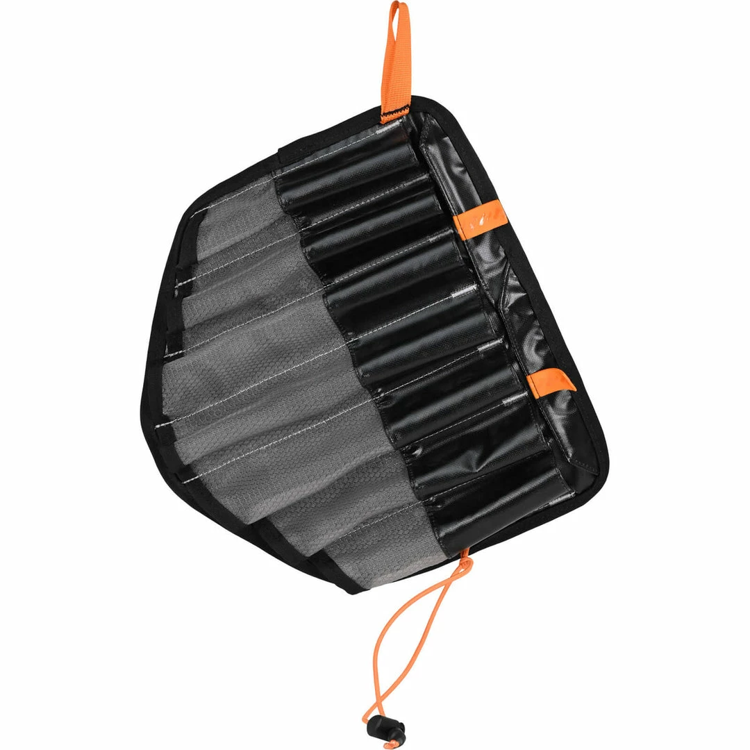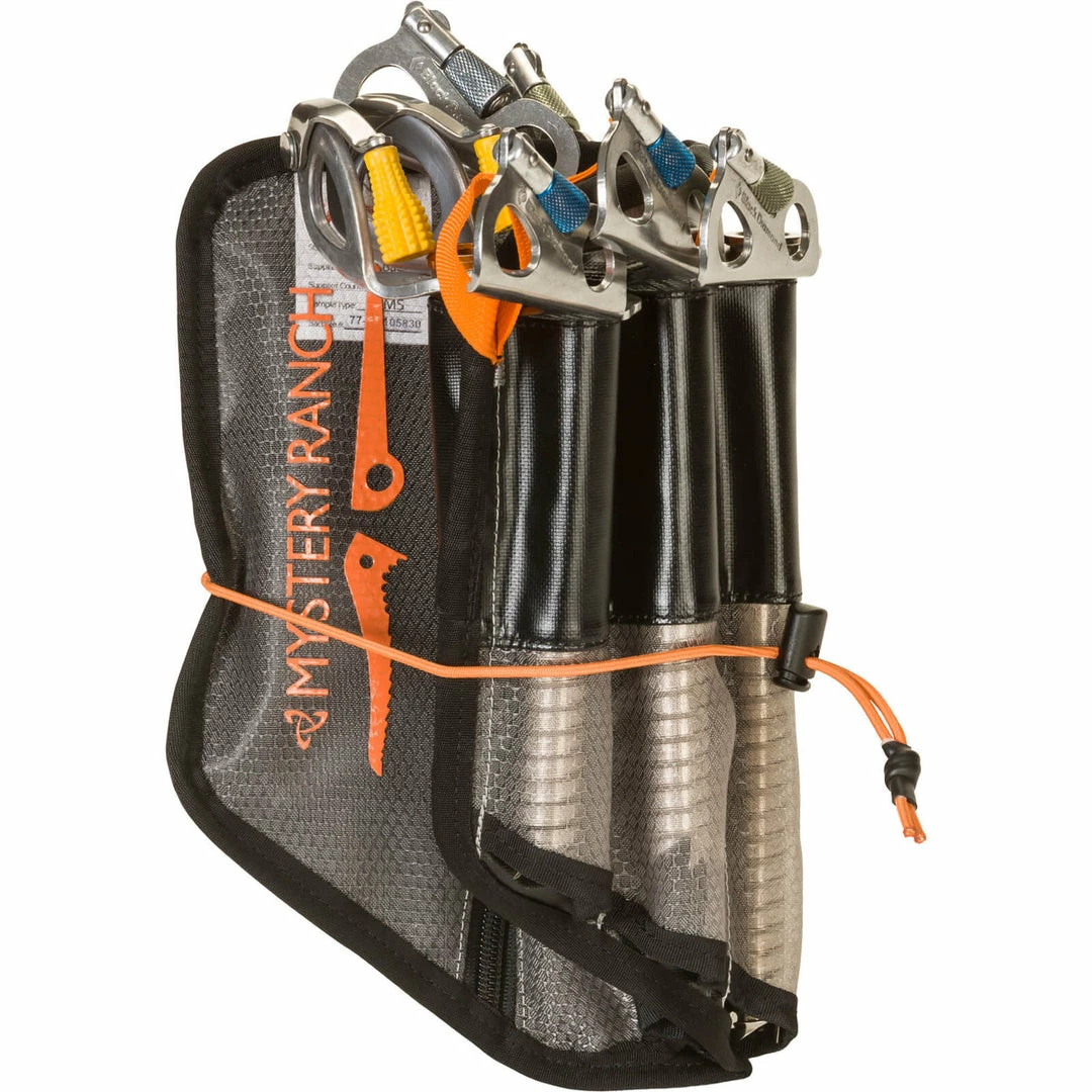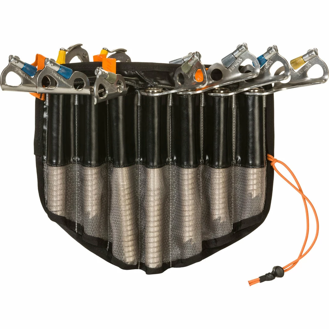 A dedicated zippered pocket and hideaway inner compartment keeps everything in one place while lightweight 3mm EVA foam provides enough cushion to prevent hardware from rubbing through. Burly and breathable mono mesh sleeves provide lightweight protection when transporting your screws inside your pack but also allows them to thoroughly dry out when the day is over without having to unpack each screw individually. Retention flaps above the screw sleeve keep them from falling out when the pouch is inverted or tossed into your pack. If you decide to run a lighter kit, you can wrap your crampons in for a light and versatile setup.