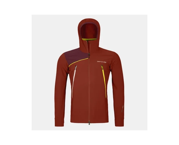 The extremely scuff-resistant outer material of the PALA HOODED JACKET for men achieves more than 50,000 abrasion cycles in the Martindale test, which is used to measure scuff resistance. Reinforcements in particularly high-stress areas such as the hips, shoulders and underarms offer maximum protection against craggy rocks. The 4-WAY stretch material provides full freedom of movement, enhanced by an athletic cut and anatomically shaped elbow areas. Thanks to its no-membrane construction, the PALA HOODED JACKET for men is particularly breathable, while fine MERINO WOOL inside offer additional comfort.