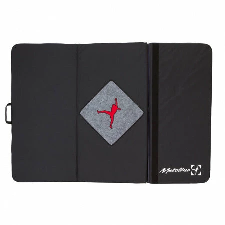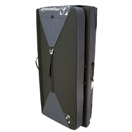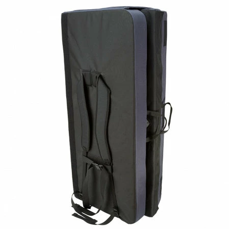The Recon pad offers 5ยฝ sq. ft. (0.51 sq. m) more landing area than standard-sized pads but almost 4″ (100 mm) narrower when folded for a cleaner carry and easier storage. 900d body fabric for maximum durability and cross-clipper logo rug for cleaning shoes. Sandwich foam design for maximum impact absorption: 1″ (25 mm) closed-cell top layer, 2ยฝ” (60 mm) open-cell center, and ยฝ” (15 mm) closed-cell base layer. Angle cut hinges eliminate the gutter found in other designs. Small external stash pocket and larger inner pocket for shoes, chalk bag, etc., plush padded shoulder straps, dual sets of drag handles, and aluminum buckles that are guaranteed for life. Closure flap reverses to cover shoulder straps while the pad is on the ground.