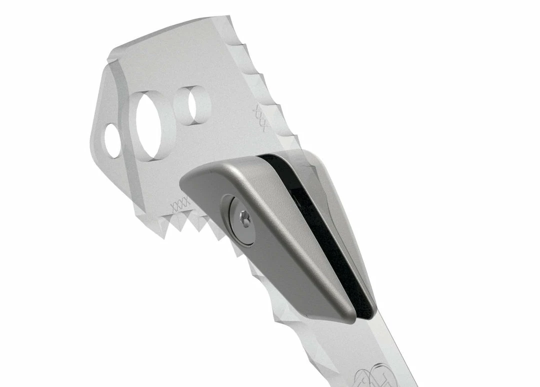 The weights are positioned on each side of the pick. The balance of the ice axe during the strike is improved for precise placements in hard ice. The shape of the weights optimizes slotting the pick into cracks. The weights are removable, to adjust the technical aspects and weight of the ice axe for the route.