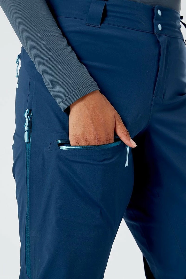 The Womenโs Khroma Kinetic Pant is purpose-built for uphill practicality as well as downhill protection. It uses new three-layer Proflexโข fabric, with a moisture-wicking inner knit and a DWR-treated 20D stretch-woven outer for the ideal combination of extreme mountain waterproofing and sweat-free dryness on gruelling ascents. With integrated elastane, the โsoftโ hardshell texture offers outstanding mobility for technical climbs and, for extra mountain utility, the Womenโs Khroma Kinetic Pant also features an adjustable waist, side-venting zips and removable braces. In addition to reinforcement patches for ski buckles and edges, there are easy-access pockets for every quick-grab item the ski mountaineer might need.