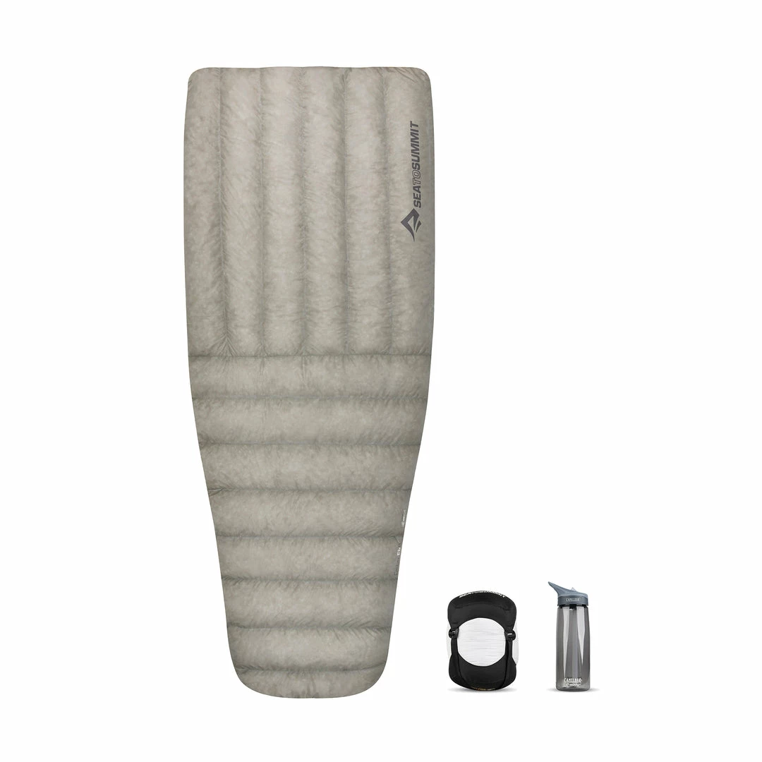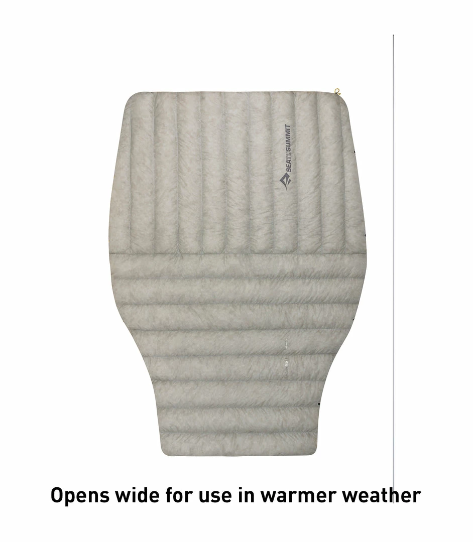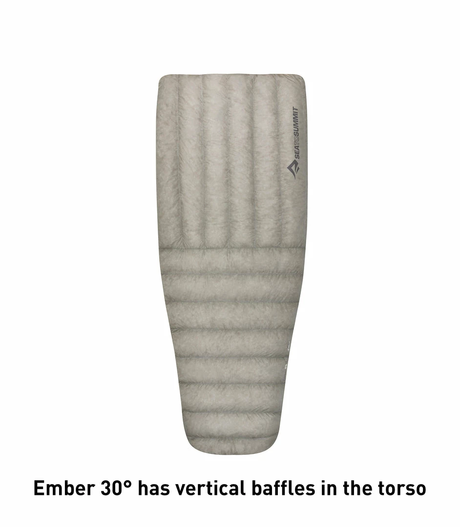 The Emberโข Series takes the simplicity of the quilt concept a step further. The high quality 850+ loft Ultra-Dry Down and 10 D outer / 7D inner shell material mean incredibly lightweight and tiny packed size. The snap-on attachment straps keep your quilt located on your sleeping mat, while the drawcord base of the 40ยฐF and 30ยฐF give the Ember a โshape-shifterโ function: wider at the base for more freedom of movement when itโs warm, snugged down when itโs cooler.